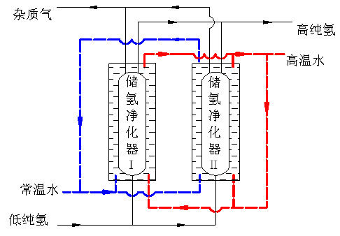 金屬氫化物儲氫凈化裝置通過以下過程實現了持續工作:(1)儲氫凈化器Ⅰ吸氫:將低純度氫通入儲氫凈化器Ⅰ,同時向水套中通入常溫水,使其開始吸氫。(2)儲氫凈化器Ⅰ放氫、儲氫凈化器Ⅱ吸氫:儲氫凈化器Ⅰ吸氫完成后,放出雜質氣,然后向其水套中通入高溫水,儲氫凈化器Ⅰ開始放出高純氫氣;于此同時,將低純度氫通入儲氫凈化器Ⅱ,使其開始吸氫。(3)儲氫凈化器Ⅱ放氫、儲氫凈化器Ⅰ吸氫:儲氫凈化器Ⅰ放氫完全后,此時儲氫凈化器Ⅱ完成吸氫;向儲氫凈化器Ⅱ的水套中通入高溫水,使其開始放氫;同時將低純度氫通入儲氫凈化器Ⅰ,使其開始吸氫。如此通過兩個儲氫凈化器交叉進行吸放氫,實現了連續凈化氫氣的操作。